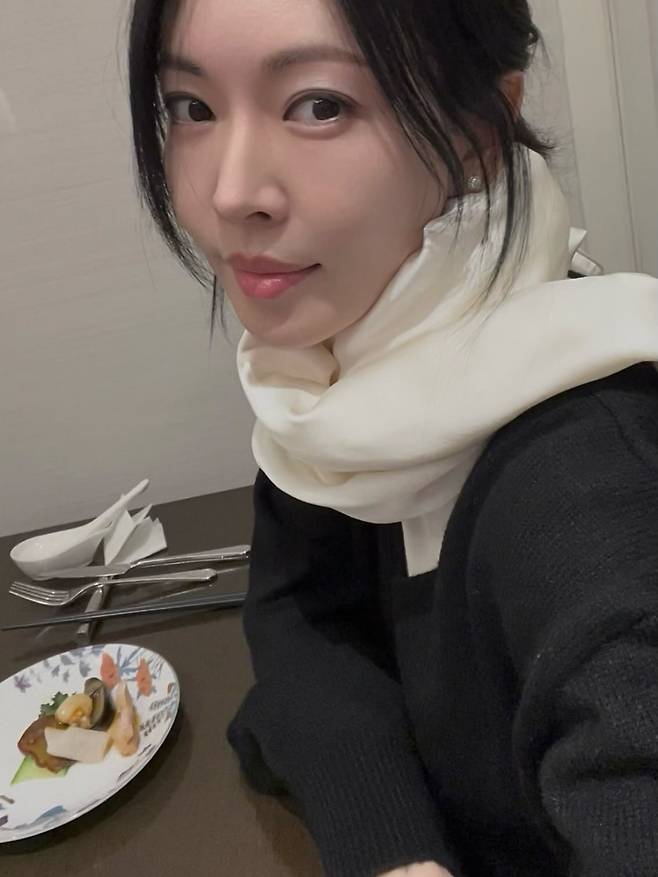 특히 목선에 둘러진 하얀색 목도리의 풍성한 질감은 그녀의 작은 얼굴을 더욱 돋보이게 하며, 식사 자리의 정갈한 분위기와도 아주 훌륭한 조화를 보여주고 있습니다.