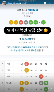 신지는 지난 21일 자신의 SNS를 통해 “엄마 나 복권 당첨됐어”라는 글과 함께 사진 한 장을 게재했습니다. 공개된 사진은 제1212회 로또 당첨 번호를 확인한 결과로, 신지는 당첨 번호 ‘5, 8, 25, 31, 41, 44’ 중 4개 번호(5, 8, 31, 41)를 맞히며 4등에 당첨되었습니다.
