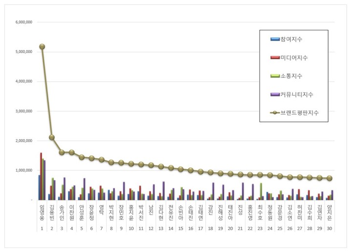 전체 트로트 가수 브랜드 빅데이터는 전월 대비 6.58% 줄었고, 브랜드 소비는 13.38% 감소했다. 브랜드 이슈, 소통, 확산 지수도 각각 감소세를 보였다.
