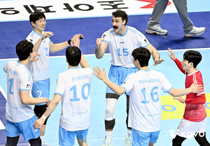 대한항공 정지석이 17득점, 러셀이 15득점으로 힘을 보탰다. 1세트를 25-19로 차지한 대한항공은, 2세트도 상대 실책을 틈타 점수차를 크게 벌렸다. 3세트에서도 대한항공이 기세를 이어가며 김민재의 속공으로 최종 마침표를 찍었다.