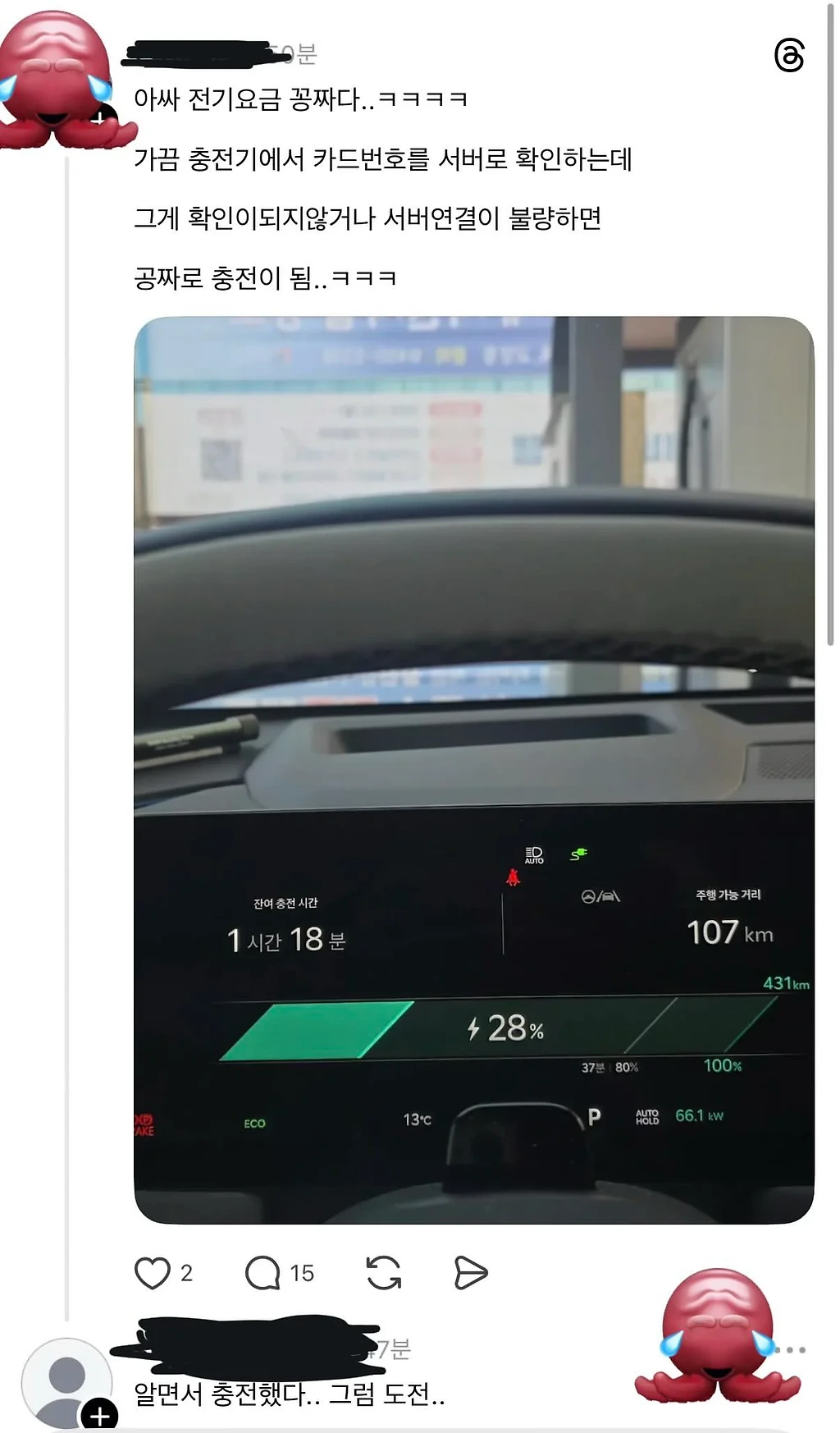 서버연결 불량으로 공짜로 충전했다는 전기차 차주