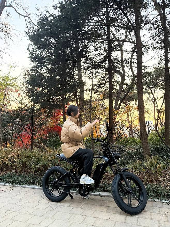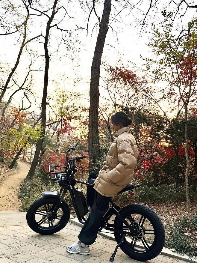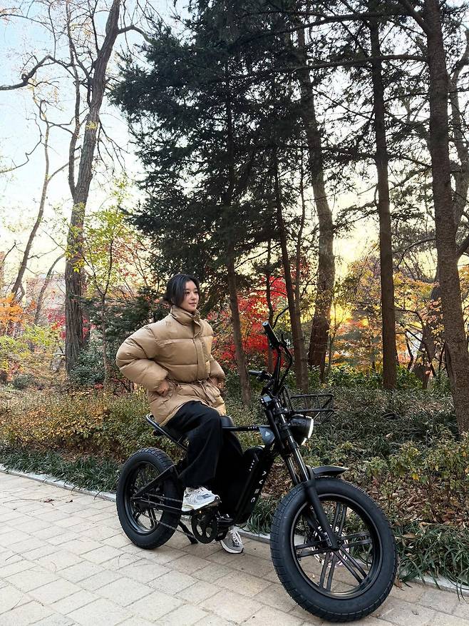 여기에 밝은 회색 운동화를 신어 경쾌한 활동성을 강조했으며, 자전거에 올라타 자연스럽게 포즈를 취한 모습은 정해진 틀에 박힌 차림보다 훨씬 더 생동감 넘치는 멋을 전달해 줍니다.