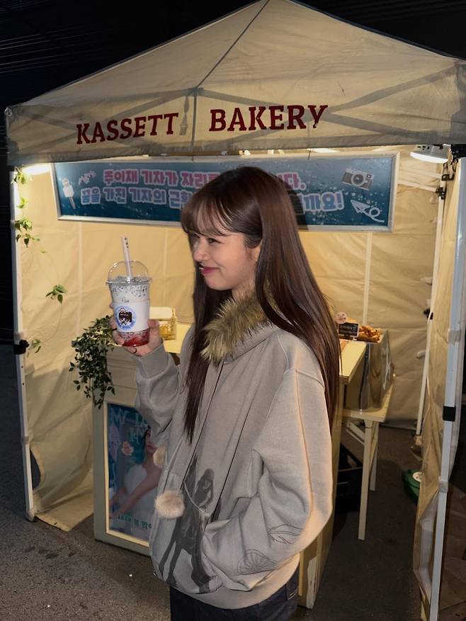 특히 후드 끈 끝에 달린 동그란 털 뭉치 장식은 그녀의 귀여운 표정과 어우러져 전체적인 차림에 사랑스러운 생기를 불어넣는 영리한 포인트가 됩니다.