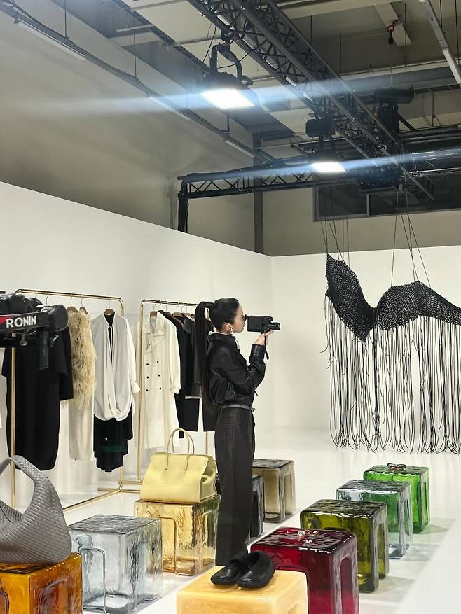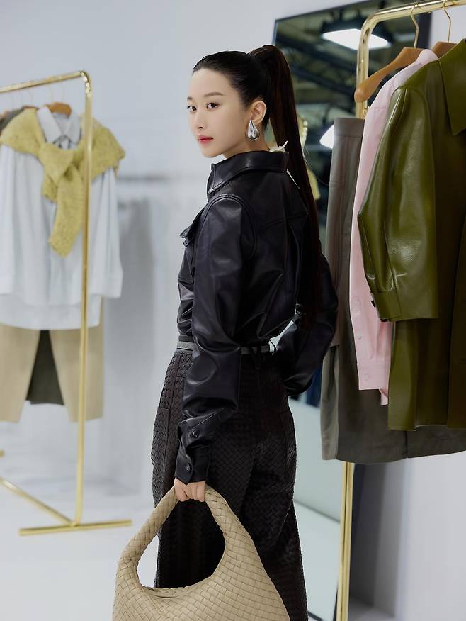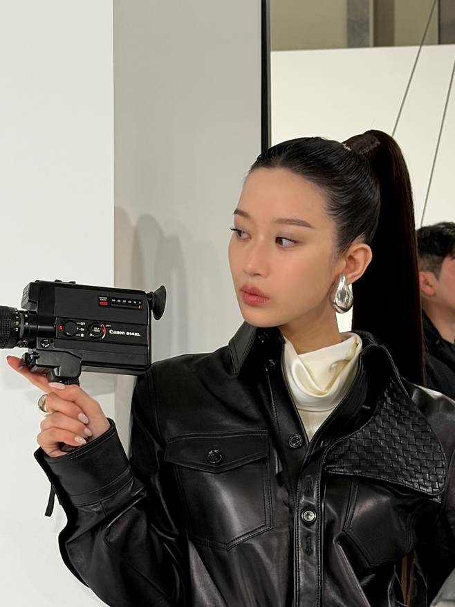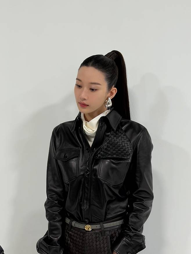 특히 셔츠 한쪽 가슴에 더해진 촘촘한 격자무늬 짜임 디테일은 자칫 단조로울 수 있는 가죽 의상에 입체적인 깊이감을 더해주며 문가영 특유의 고급스러운 분위기를 잘 살려주고 있네요.
