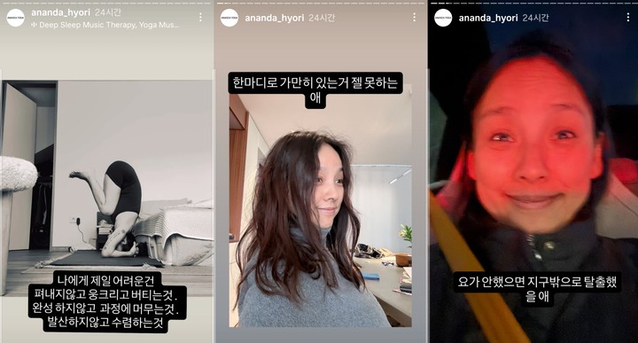 이효리는 이번 게시글에서 “나에게 제일 어려운 건 펴내지 않고 웅크리고 버티는 것. 완성하지 않고 과정에 머무는 것. 발산하지 않고 수렴하는 것”이라는 진중한 문장과 함께 직접 요가 동작을 선보였다.