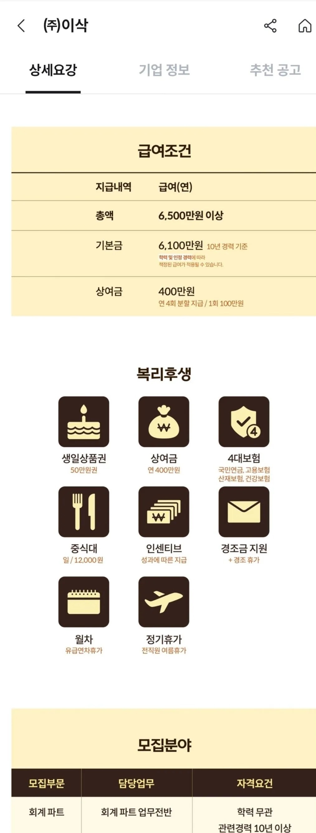 해당 공고의 모집 부문은 회계 파트다. 담당 업무는 회계 파트 업무 전반. 자격요건은 학력 무관에 관련 경력 10년 이상이다. 급여 조건은 기본금 6100만원(10년 경력 기준)에 상여금 400만원을 더해 총 6500만원 이상이다. 복리후생으로는 생일상품권 50만원권, 4대보험, 중식대 일 1만2000원, 성과에 따른 인센티브, 경조금 지원 및 경조 휴가, 유급연차휴가, 전 직원 여름 정기휴가가 포함됐다.