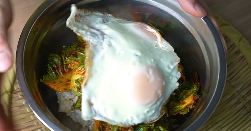 이제 조립 단계다. 따뜻한 밥을 그릇에 담고, 그 위에 썰어둔 봄동을 한 움큼 넉넉히 올린다. 팬에 기름을 약간 두르고 반숙으로 부친 달걀프라이를 가운데 얹는다. 참기름을 한 바퀴 두르고 김가루를 뿌리면 기본 세팅이 끝난다. 마지막으로 준비한 양념장을 1~2큰술 올린 뒤 기호에 따라 추가한다.