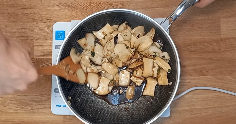 처음에는 중불을 유지해 3분에서 4분 정도 자박하게 졸인다. 이때 버섯을 계속 뒤적이기보다는 팬을 기울여 양념을 끼얹듯이 코팅하는 방식이 좋다. 강한 불에서 짧게 조려야 표면에는 윤기가 돌고 속은 쫄깃함이 유지된다. 양념이 절반 이상 줄어들면 불을 줄이고 마무리 단계로 넘어간다.