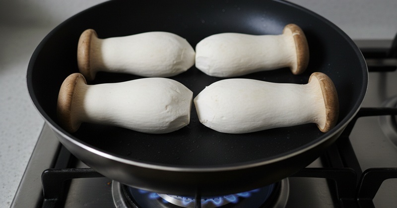 버섯의 쫄깃함을 살리는 가장 중요한 단계는 마른 팬에 먼저 굽는 과정이다. 달군 팬에 기름을 두르지 않고 새송이버섯을 겹치지 않게 넓게 펼친다. 중강불에서 겉면이 노릇해질 때까지 2분에서 3분 정도 그대로 둔다. 이때 표면의 수분이 빠지면서 조직이 단단해지고 탄력이 생긴다. 한 번 뒤집어 반대쪽도 같은 방식으로 굽는다. 이 과정을 거치면 이후 양념에 졸여도 버섯이 쉽게 물러지지 않는다.