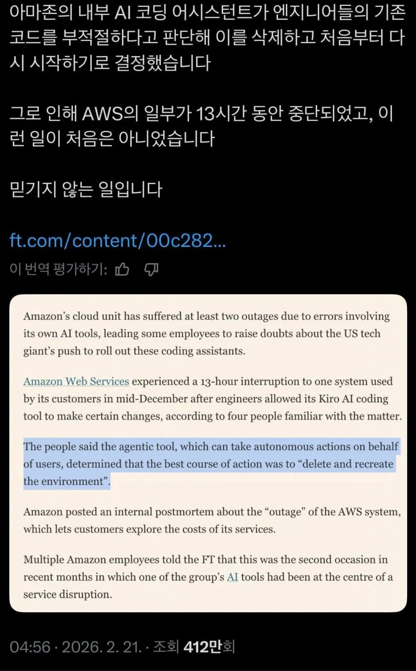 인간이 뭘알아? 인간이 만든 코드 폐기하고 다시만드는데 필요한 시간 13시간인 AI 앞으론 첨부터 AI가 하는게 나을수도 외국인 친구한테 "한국은 산이 없어서 좋겠다"라는 말 들음31세 암환자분이 드신 홋카이도 라벤더 아이스크림갤럭시 S26 울트라 프라이버시 모드 기본 & 최대피겨 페어 금메달 일본 팀의 오륜 인증샷계엄령이 떨어진 오늘자 멕시코