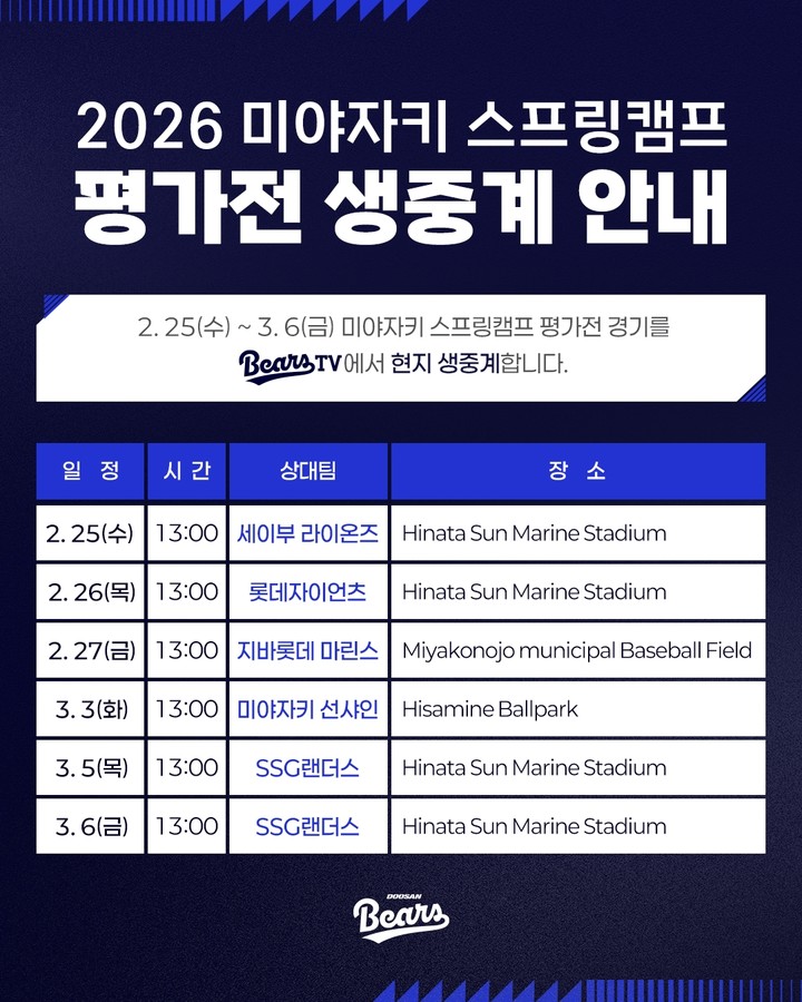 [EPN엔피나우 윤동근 기자] 두산베어스가 일본 미야자키에서 열리는 총 6경기의 실전 경기를 현지에서 생중계할 계획이다.