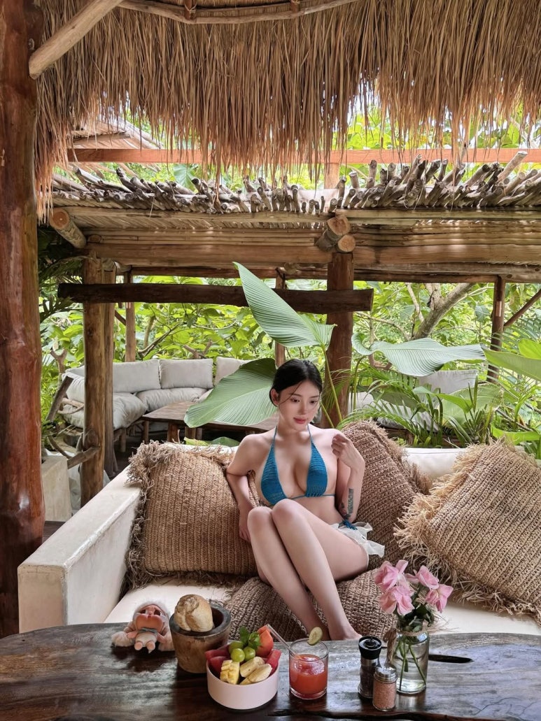 인스타그램의 핫한 @xiangerrrr의 발리 휴양지 룩이 에메랄드빛 바다와 완벽하게 어우러지는 블루 크로셰 비키니로 주목받고 있어요.