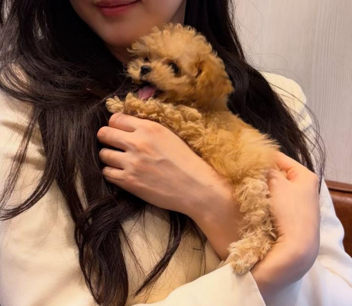 김사랑은 23일 자신의 소셜미디어에 “아이 동생으로 입양해야 하냐, 너무 귀엽다”라는 글과 함께 사진을 공개했다. 해당 사진에는 그의 품에 갈색 푸들을 안고 있는 모습이 담겼다.