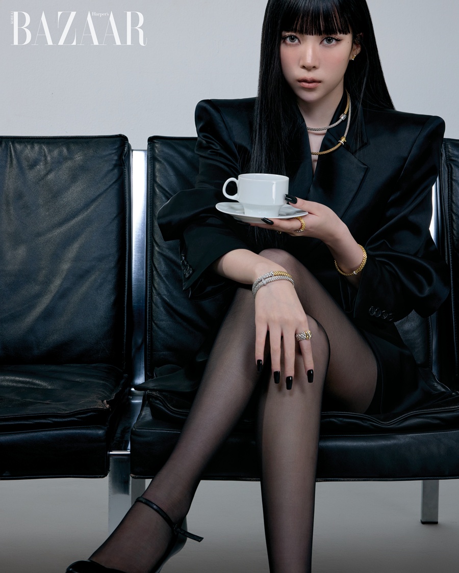 데뷔 이래 처음 시도한 레드 립 메이크업 역시 눈길을 끈다. 여기에 화이트 골드가 볼드한 존재감을 발하는 '에센셜', '파노라마', '방돔' 컬렉션을 믹스매치해 명민한 패션피플의 자태를 뽐낸 것. 다이아몬드를 파베 세팅한 슬라이더로 자유로운 스타일링이 가능한 18K 화이트 골드 '아리아' 네크리스도 빼놓을 수 없다.