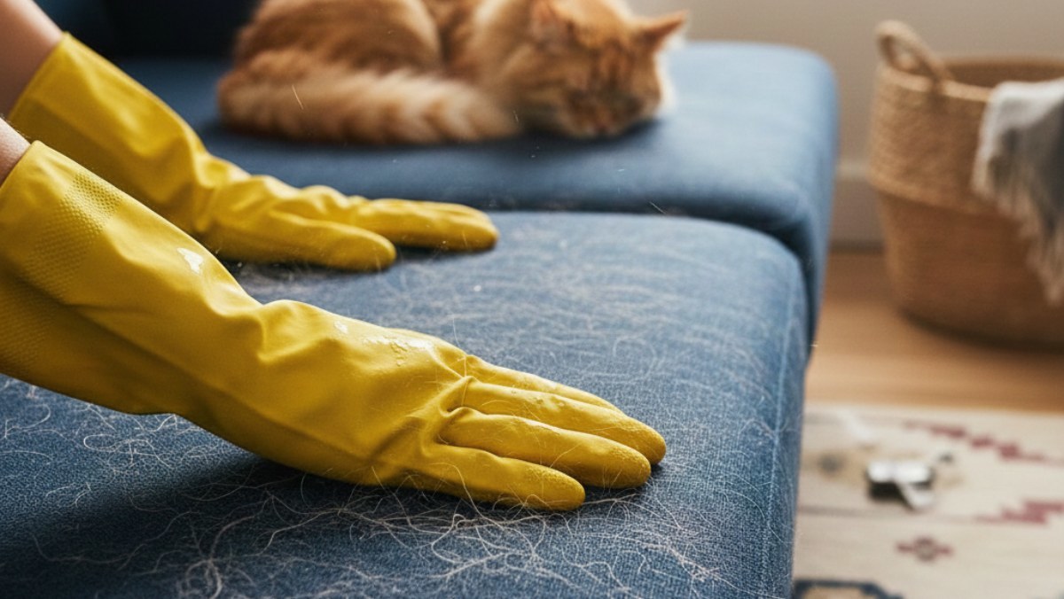 고무장갑의 가장 놀라운 활용법 중 하나는 바로 '정전기'를 이용한 청소다. 손바닥에 돌기가 살아있는 고무장갑을 끼고(구멍 난 장갑이어도 상관없다) 물을 살짝 묻힌 뒤, 반려동물의 털이 박힌 카펫이나 천 소파를 한 방향으로 슥슥 문질러보자. 돌기 사이에 정전기가 발생하며 청소기로도 해결되지 않던 미세한 털과 먼지들이 뭉쳐서 나온다. 이는 테이프 클리너를 반복해서 사용하는 것보다 경제적이며 섬유 손상도 적다.