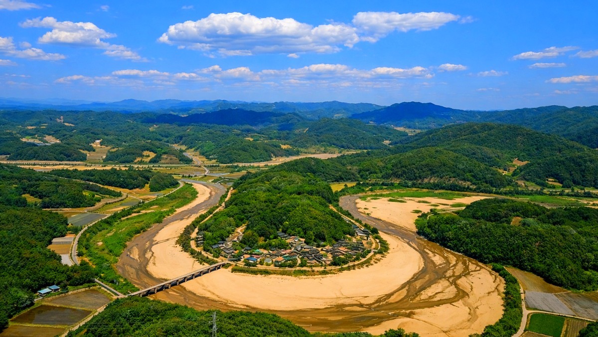경북 영주에 자리한 무섬마을이다. 이곳은 마을 전체가 강물에 둘러싸여 있어 마치 섬처럼 보이는데, 안동 하회마을, 예천 회룡포와 함께 경북의 대표적인 물돌이 마을로 꼽힌다. 물돌이 마을이란 강물이 산이나 마을을 휘감아 돌며 흐르는 지형을 뜻하는 순우리말이다.