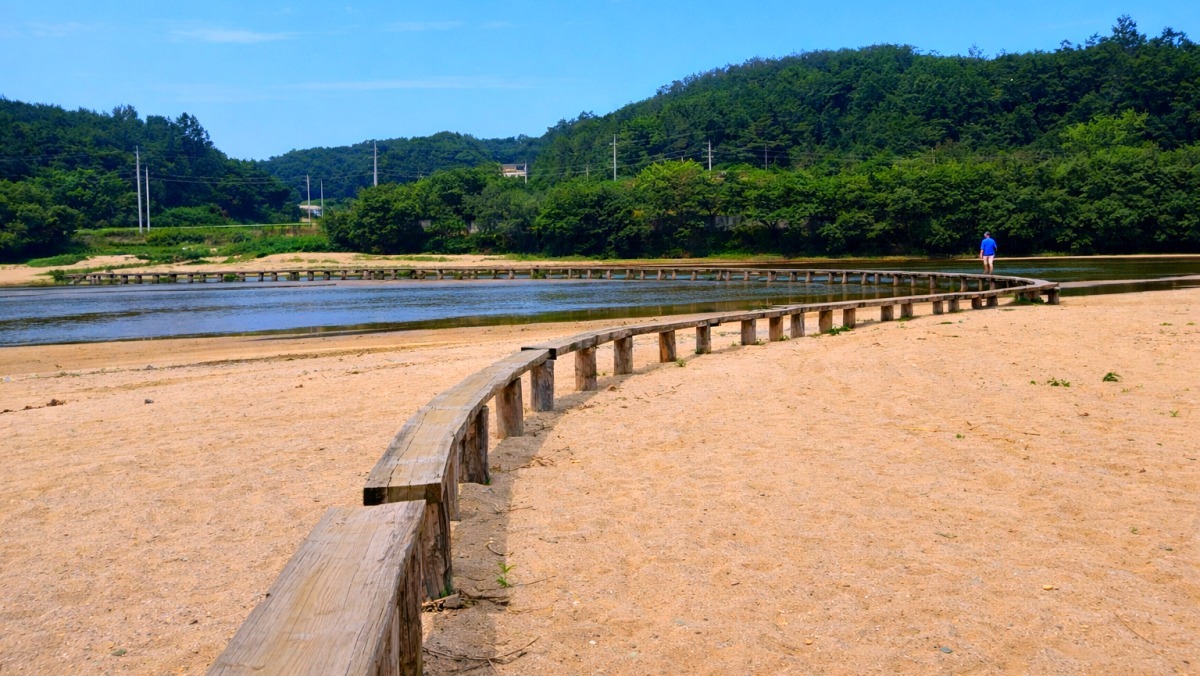 다리가 일직선이 아니라 강물의 흐름에 맞춰 부드러운 곡선을 그리며 이어져 있어 위에서 내려다볼 때 훨씬 서정적이고 아름다운 풍경을 자랑한다. 과거에는 장마철 불어난 물에 다리가 떠내려가지 않도록 미리 다리를 걷어 두었다가 물이 빠지면 다시 설치하곤 했다고 전해진다.