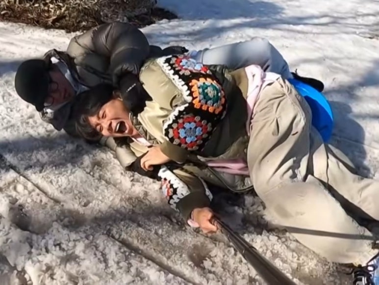 제주 눈썰매 타고 장난치는데