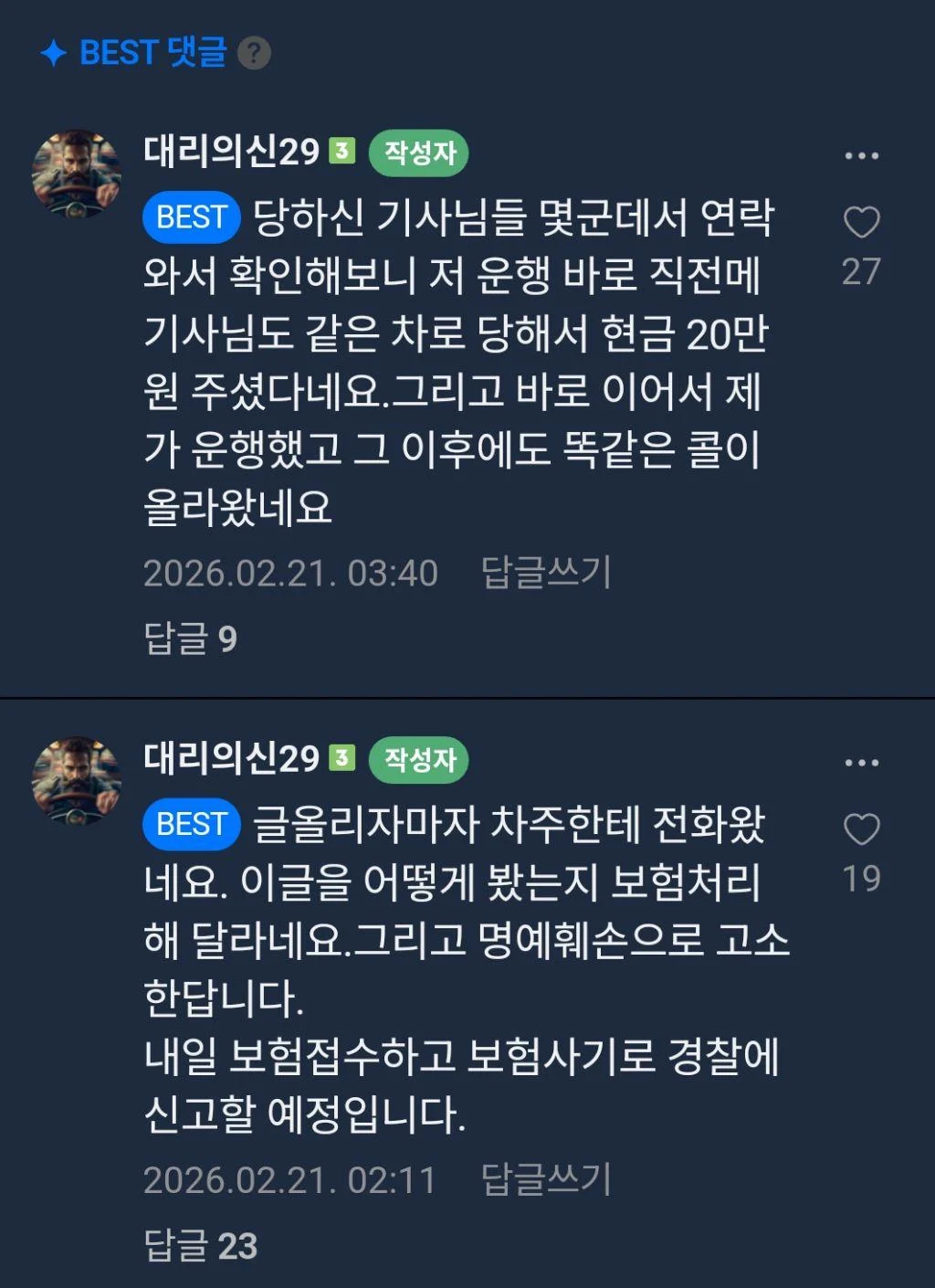4. 대리기사 카페에만 피해자가 20명이 넘고, 경찰조사시 차주 및 차주 가족 통장 까봤을때 피해자는 훨씬 많이 나올 수 있음.
