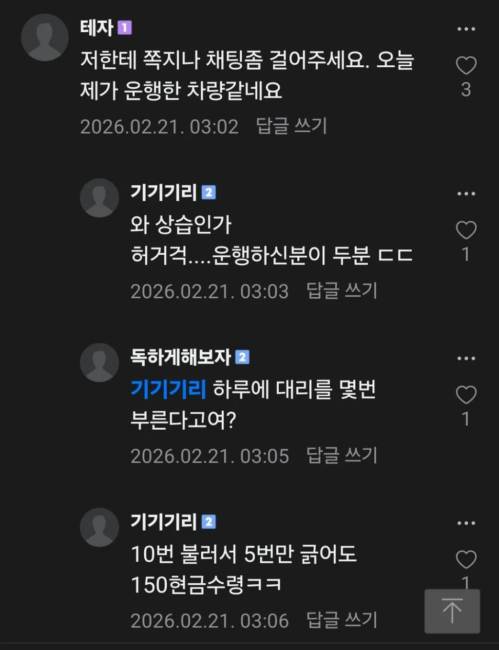 3. 하루에 대리를 몇번씩 불러서 차를 뺐다가 주차하여 사고를 유도하고 여러명에게 현금합의 유도.