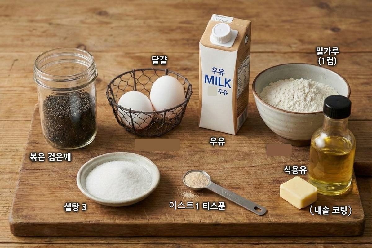 재료는 단순하다. 볶은 검은깨 1컵, 계란 2알, 우유 200ml가 핵심 베이스다. 여기에 밀가루 1컵 또는 핫케이크 가루, 설탕 3큰술, 이스트 1작은술을 더한다. 밥솥 내솥 코팅용으로 식용유나 버터도 필요하다. 특별한 도구 없이 믹서기와 밥솥이면 충분하다.