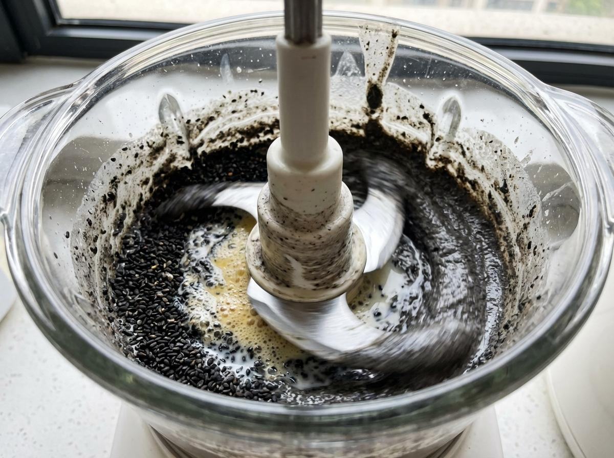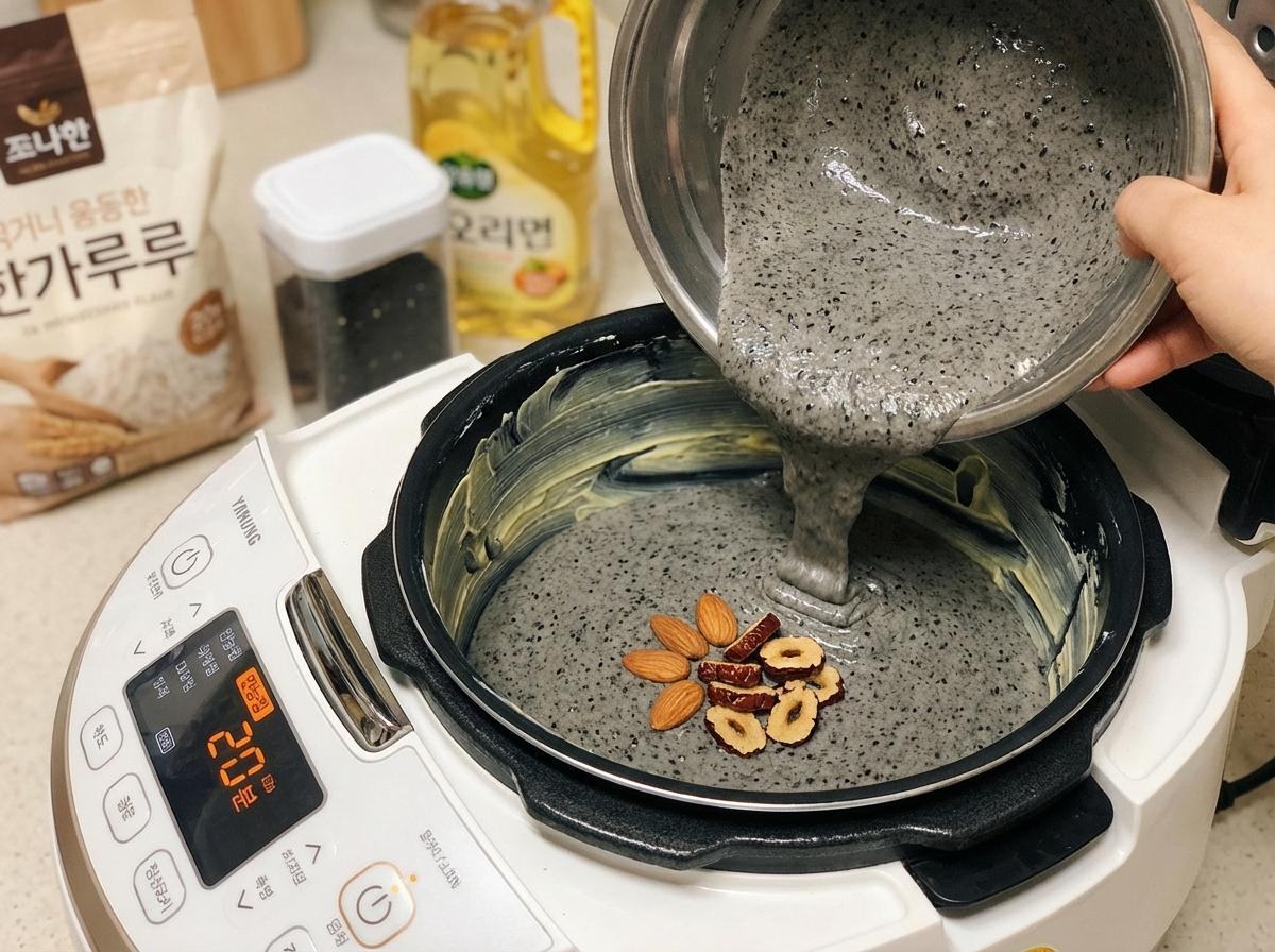 과정의 출발점은 볶은 검은깨와 계란물이다. 깨에 바로 계란을 부어 먼저 섞으면, 깨가 액체를 머금어 갈릴 때 더 곱게 분쇄된다. 여기에 우유를 넣고 믹서기로 충분히 갈면 검은빛이 고르게 도는 액체가 된다. 알갱이가 굵게 남으면 식감이 거칠어질 수 있어 최대한 곱게 가는 것이 좋다.
