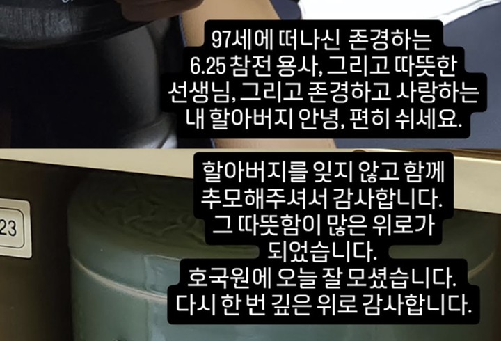 이어 “할아버지를 잊지 않고 함께 추모해 주셔서 감사합니다. 그 따뜻함이 많은 위로가 됐습니다. 호국원에 오늘 잘 모셨습니다. 다시 한번 깊은 위로 감사합니다”라고 밝히며, 팬들의 위로에 마음을 전했다.