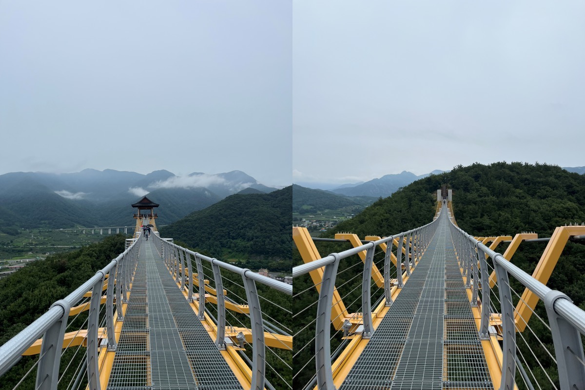 정상부에 가까워질수록 시야가 서서히 트인다. 나무 사이로 다리 구조물이 모습을 드러내고, 마지막 구간을 지나면 출렁다리 입구에 닿는다. 다리 위를 한 걸음 내디디는 순간 발 아래로 전해지는 미묘한 흔들림이 긴장감을 만든다. 난간을 잡고 천천히 이동하면 다리 중앙이 가장 탁 트인 포인트다. 이곳에서는 능선과 계곡, 멀리 이어지는 산줄기를 한 번에 담을 수 있다.
