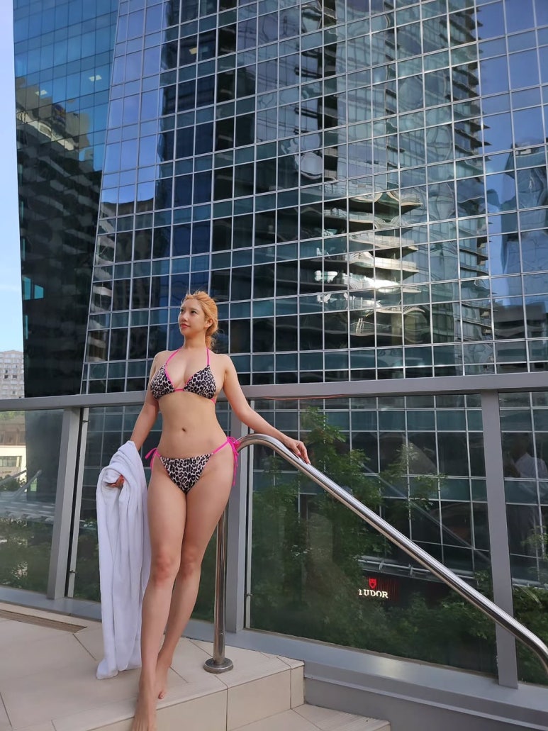 모델 윤체리의 도심 루프탑 비키니 룩! 레오파드&형광 핑크로 완성한 시티 바캉스 무드