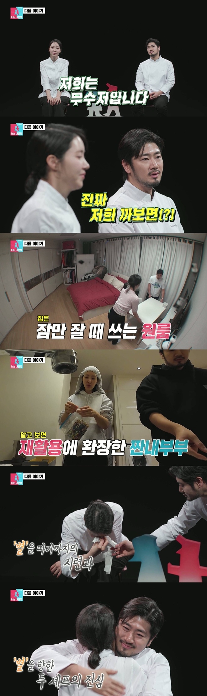 실제로 두 사람은 미슐랭 스타 셰프라는 명성과 상반되는 소박한 ‘원룸 라이프’를 공개해 놀라움을 자아냈다. 부부는 제대로 된 화장대조차 없는 공간에서 생활하고 있었고, 김희은은 “집은 오로지 기능에 충실한 원룸”이라고 소개하며 ‘반전 민낯’을 예고했다. 심지어 두 사람은 사용한 면봉 등을 버리지 않고 재활용하며 ‘짠내 부부’의 면모를 드러내기도 했다.