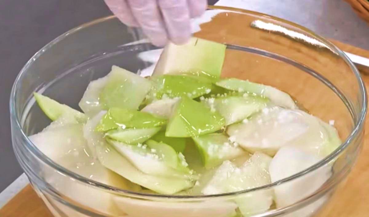 소금과 물엿을 넣고 30분 정도만 두어도 충분히 물이 나온다. 꼬들한 식감을 원하면 1시간까지 절인다. 한 시간 정도 지나면 볼 안에 물이 꽤 많이 고인다. 그만큼 무의 수분이 빠진 것이다. 절여진 무를 한 조각 먹어보면 이미 무김치 특유의 향이 난다. 수분이 빠지면서 조직이 단단해지고, 그냥 먹어도 아삭한 맛이 살아 있다.