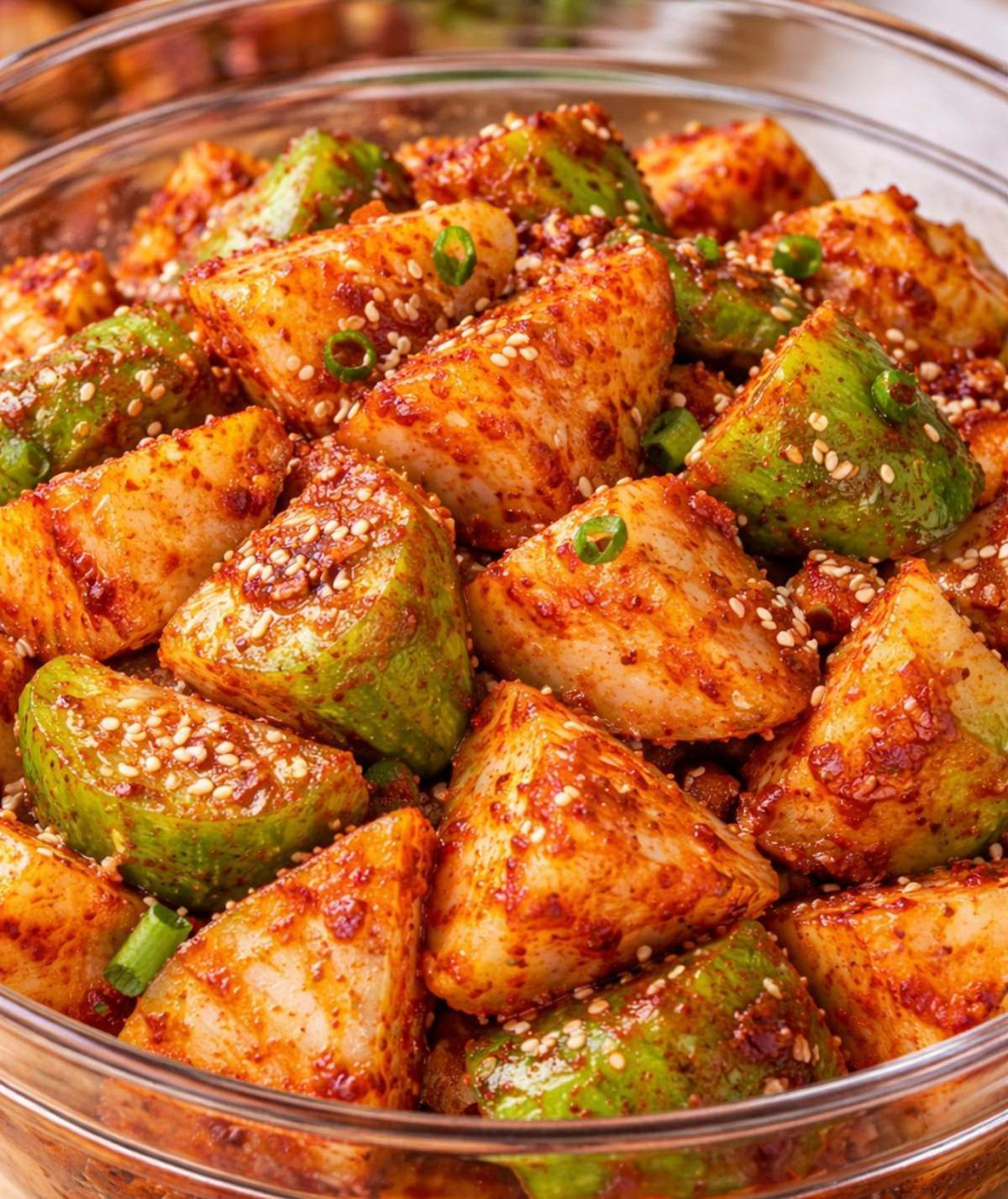 절여둔 무에 양념장을 넣고 가볍게 버무린 뒤 잠시 재워둔다. 고춧가루가 서서히 불면서 색이 선명해진다. 처음에는 하얗게 보이던 무가 점점 붉은 빛을 띤다. 양념이 겉돌지 않고 밀착되는 느낌이 난다.