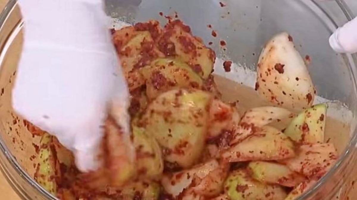 우선 무를 썬다. 그 다음 절이는 중요한 단계에서 ‘물엿’을 사용한다. 소금만 넣는 것이 아니라, 소금과 물엿을 함께 넣어 버무린다. 물엿은 단맛을 더하려는 목적이 아니다. 무 안의 수분을 빠르게 끌어내는 역할을 한다. 삼투압 작용으로 수분이 빠져나오면서 무가 더 잘 절여지고, 간이 고르게 밴다. 조청이나 올리고당으로는 같은 결과가 나오지 않는다. 이 과정에서는 반드시 물엿을 써야 한다.