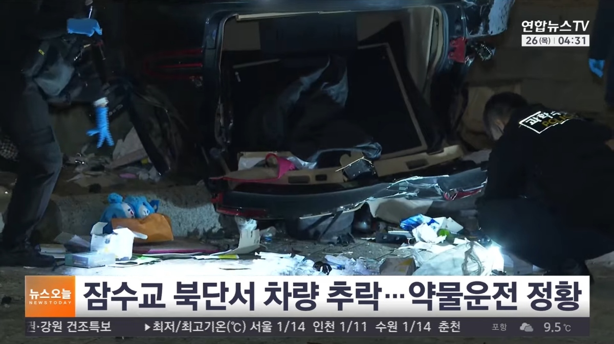 26일 연합뉴스 등에 따르면 경찰은 전날 밤 서울 반포대교에서 발생한 차량 추락 사고와 관련해 추락 차량 내부에서 마취·진정 목적의 약물이 다량 발견돼 운전자 투약 여부와 소지 경위를 조사하고 있다.