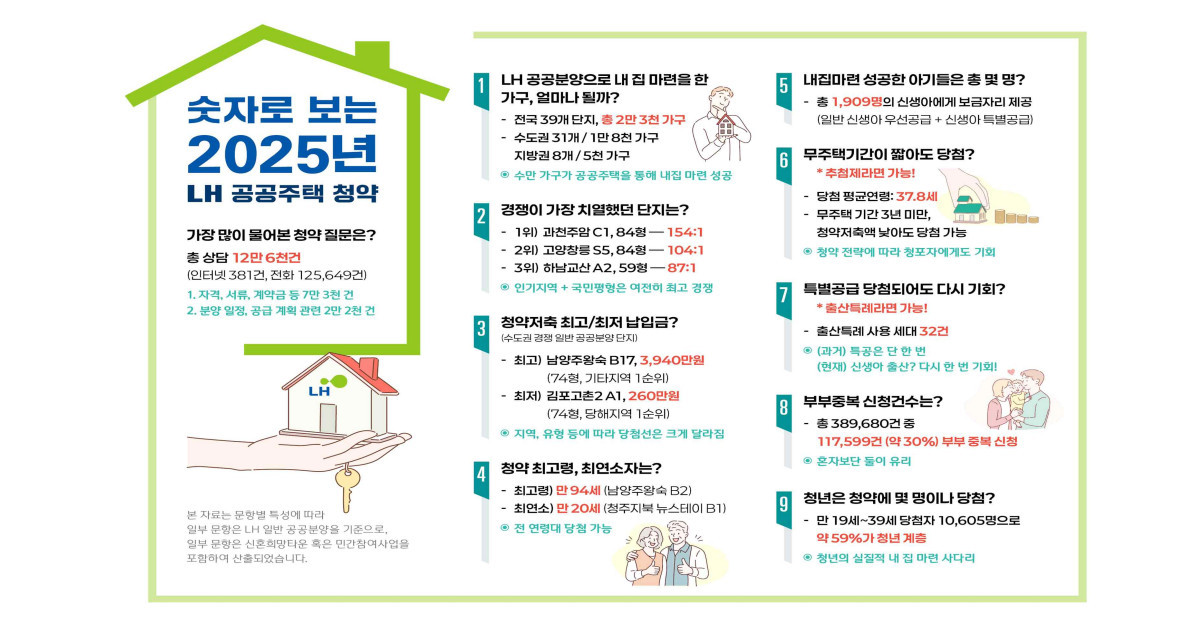 청약 관련 상담은 총 12만 6천 건이 진행되었으며 이 중 전화 상담이 12만 5649건으로 대부분을 차지했다. 상담 내용별로는 자격 요건과 서류, 계약금 관련 문의가 7만 3천 건으로 가장 많았고 분양 발표 및 공급 계획 등에 대한 문의가 2만 2천 건으로 집계됐다. LH는 공공분양이 무주택 실수요자의 주거 사다리 역할을 충실히 수행할 수 있도록 향후에도 적기에 안정적인 공급을 이어가겠다는 방침을 밝혔다.