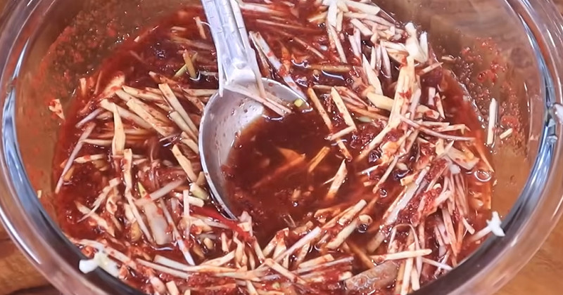 이제 양념을 만든다. 고춧가루 4큰술, 다진 마늘 1큰술, 다진 생강 1작은술, 액젓 2큰술, 매실청 1큰술을 넣어 기본 간을 맞춘다. 여기에 채 썬 양파 1/2개와 가늘게 썬 당근 약간을 더하면 식감이 한층 풍부해진다. 기호에 따라 찹쌀풀을 2큰술 정도 넣으면 양념이 케일에 더 잘 붙고 맛이 부드러워진다.