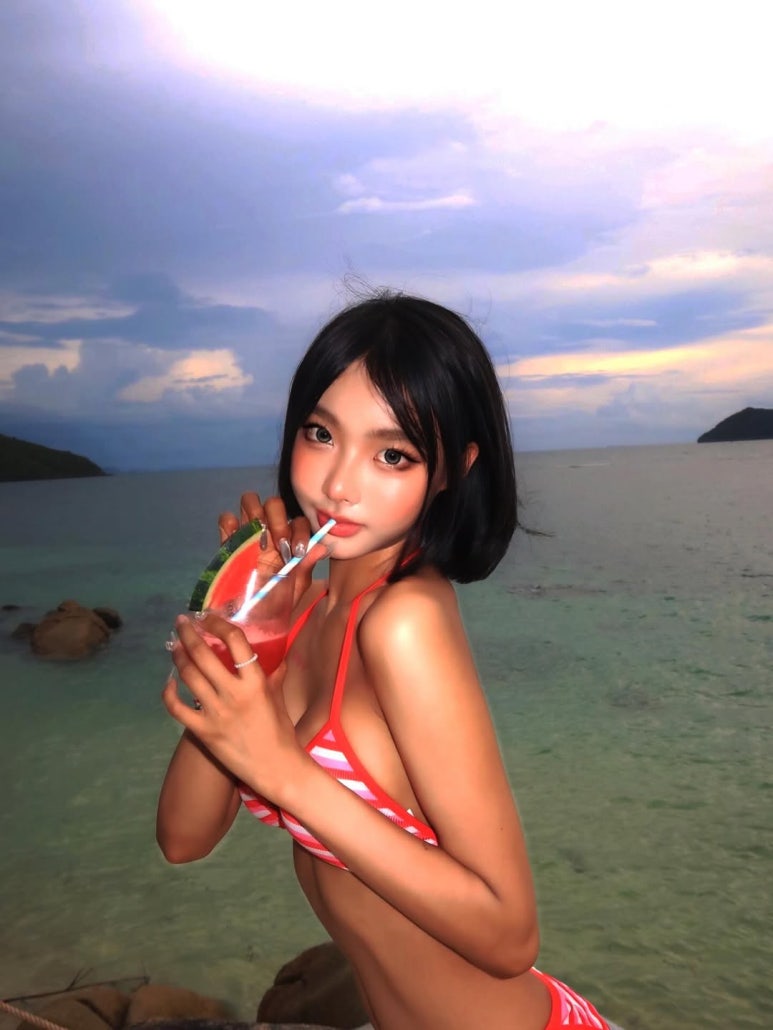 레드 하트 비키니&블루 볼캡은 힙한 스트릿 감성을, 오렌지 스트라이프 비키니&선셋 메이크업은 신비로운 해변 무드를 보여줬죠. ✨