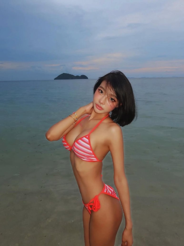 이번에는 오렌지와 화이트가 섞인 스트라이프 비키니를 선택했어요.