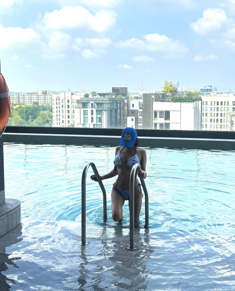 상의는 귀여운 레드 하트 포인트가 들어간 화이트 비키니로 러블리함을 살렸고, 하의는 시원한 블루 스트라이프 패턴을 선택해 스포티한 느낌을 더했어요. 💫