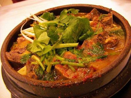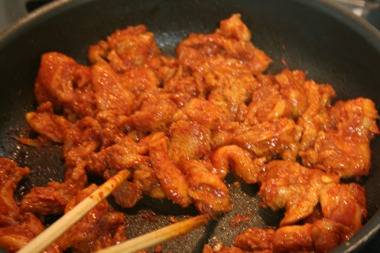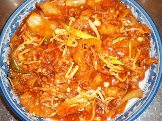 바로 국물에 말아 먹는 밥과 함께 곁들이는 장아찌나 짜게 졸인 자반고기가 아닌, 뜨거운 국물 그 자체와 함께 먹는 자극적인 고추장 볶음 반찬입니다.