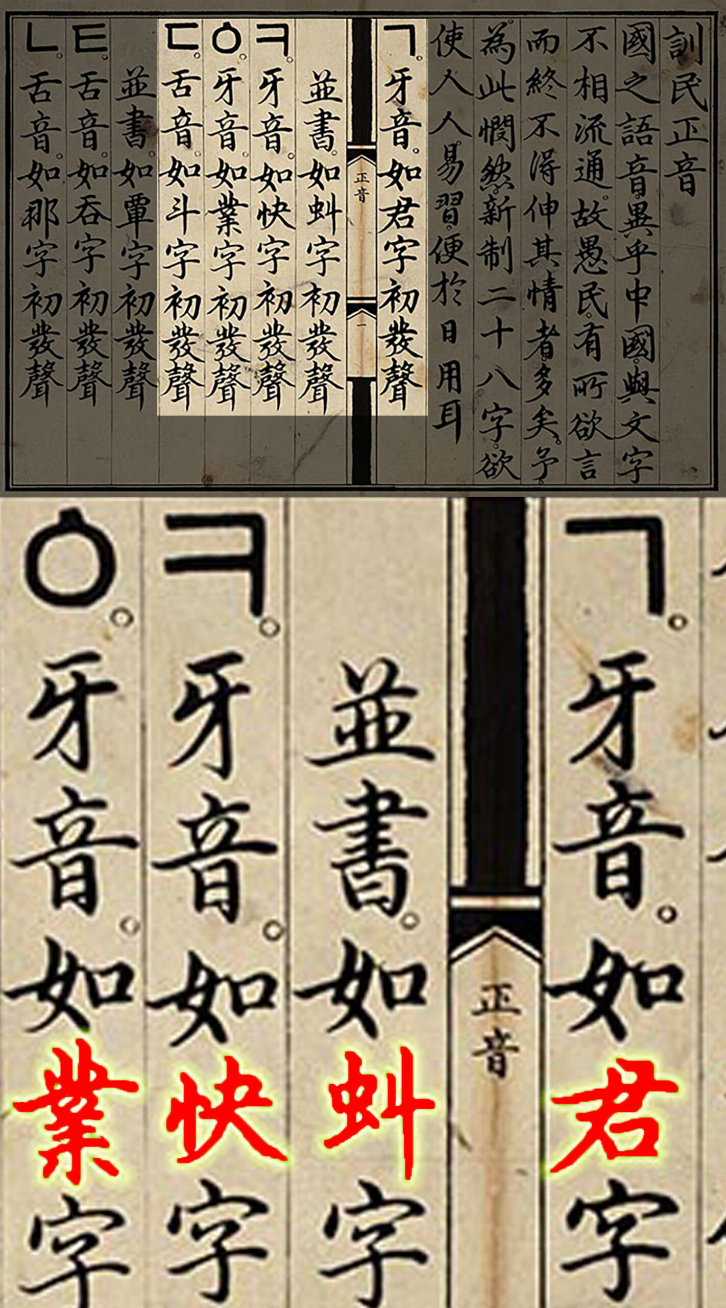 발단은 훈민정음의 자음 발음을 설명하기 위해 예시로 든 한자들의 조합이다. 해례본에서는 아음(牙音, 어금닛소리)인 ‘ㄱ, ㄲ, ㅋ, ㆁ’을 설명하기 위해 각각 군(君), 규(虯), 쾌(快), 업(業)이라는 한자를 사용했다. 단순히 글자의 초성을 알려주기 위한 배치처럼 보이지만, 이 네 글자를 이어 붙이면 ‘군규쾌업(君虯快業)’이라는 하나의 문장이 완성된다.