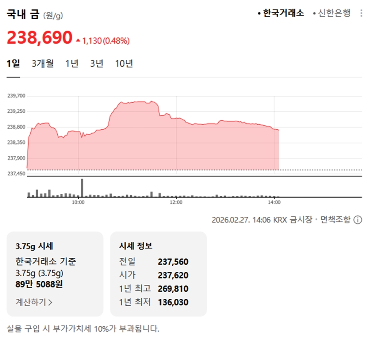 국내 금시세(금값)가 27일(이하 한국 시각) 오후 상승세(전 거래일 대비)를 보이고 있다.