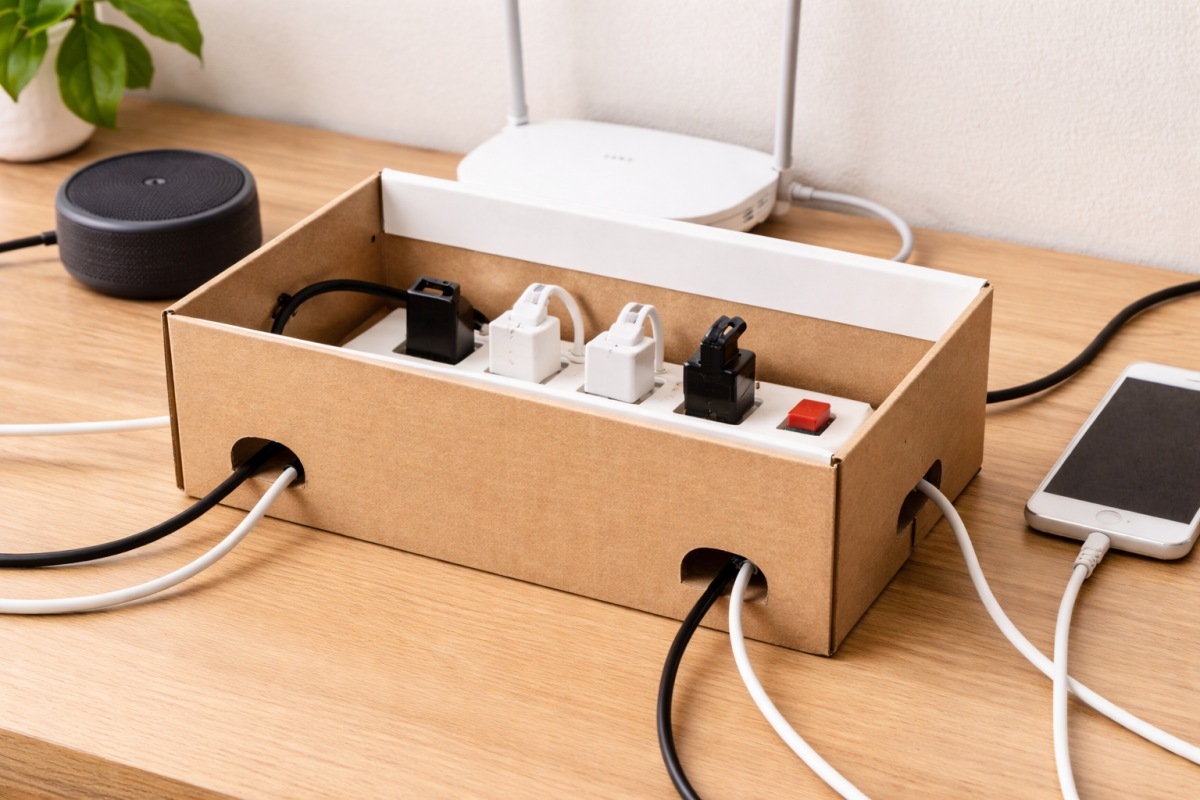 거실 TV 뒤편이나 컴퓨터 책상 아래 엉켜 있는 전선은 미관을 해칠 뿐만 아니라, 먼지가 쌓일 경우 화재의 원인이 되기도 한다. 시중에서 전선 정리함을 별도로 구매하려면 개당 1~2만 원의 비용이 발생하지만, 신발 박스 하나면 이를 완벽하게 대체할 수 있다.