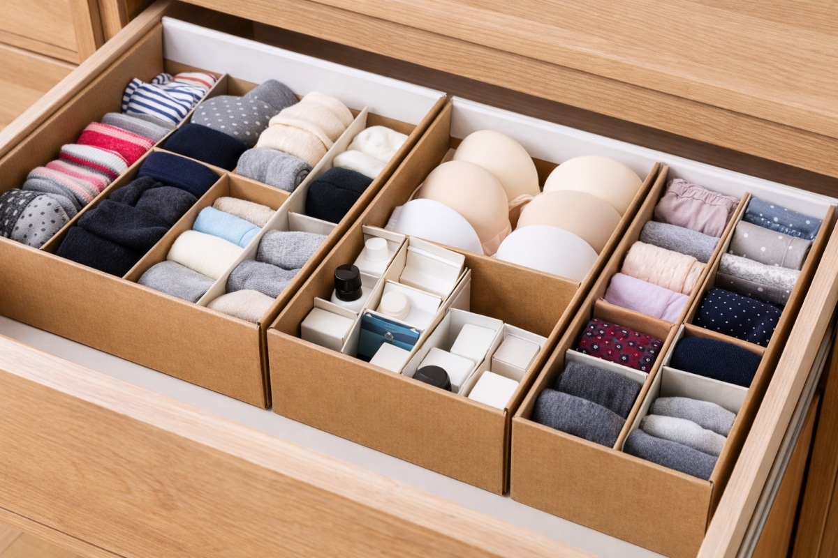 서랍장을 열 때마다 뒤섞여 있는 양말과 속옷 때문에 스트레스를 받는 이들이 많다. 칸막이가 없는 넓은 서랍은 물건을 하나만 꺼내도 전체 배열이 흐트러지기 쉽다. 이때 신발 박스는 서랍 내부를 깔끔하게 정리할 수 있다.