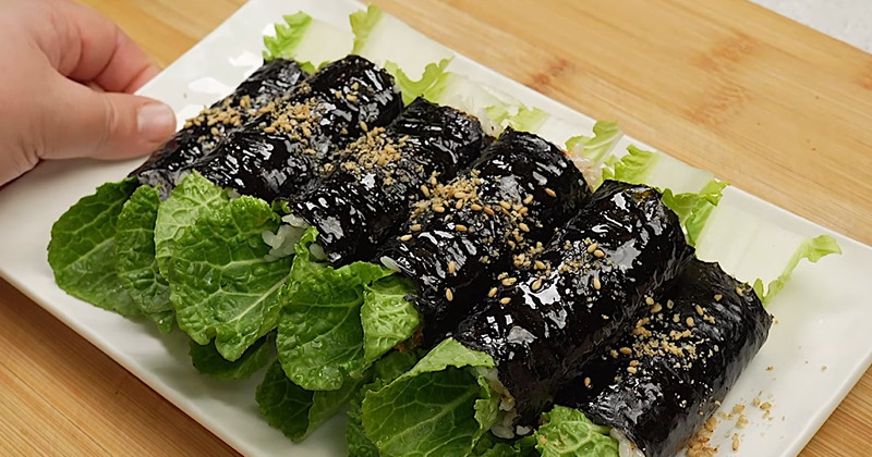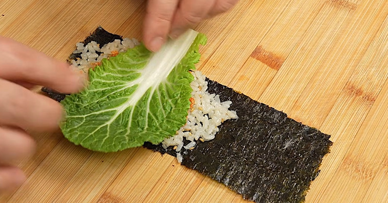 김 위에 밥을 얇게 펴고, 그 위에 봄동을 넓게 올린다. 잎이 넓지 않아도 여러 장을 겹쳐 깔면 된다. 그 위에 준비한 속재료를 가지런히 얹는다. 돌돌 말 때는 힘을 균일하게 주어야 단면이 흐트러지지 않는다. 마지막에 참기름을 살짝 바르고 깨를 뿌리면 향이 살아난다.