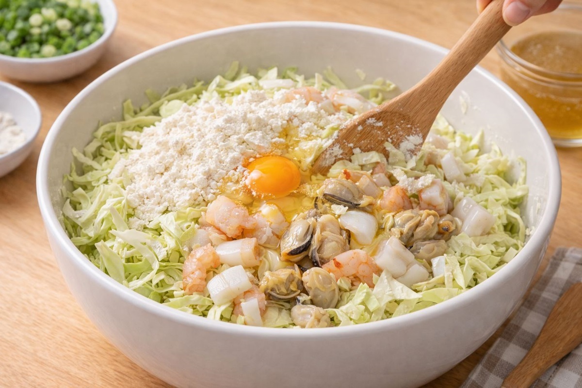 양배추는 마지막에 넣는다. 먼저 만든 반죽에 양배추를 산처럼 듬뿍 넣고 주걱으로 크게 들어 올려 뒤집듯 섞어 양배추 표면에 반죽이 얇게 코팅되게 한다. 해물은 가장 마지막에 넣되 한 번에 휘휘 섞지 말고 두세 번만 크게 섞어 위치를 골고루 분산시킨다. 해물을 오래 치대면 수분과 향이 빠져나와 맛이 밋밋해지고 오징어는 더 질겨질 수 있다.