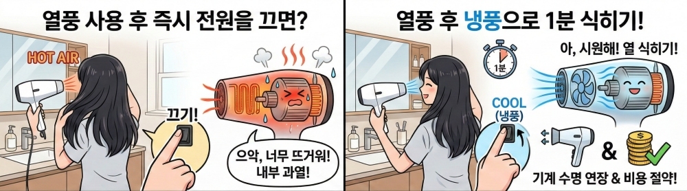 대부분은 열풍을 충분히 사용한 뒤 바로 전원을 끄는 방식으로 사용한다. 그러나 이렇게 갑작스럽게 전원을 차단하면 내부에 남아 있는 열이 빠져나가지 못해 모터와 히터에 부담을 줄 수 있다. 열풍을 오래 사용하면 드라이기 내부가 과열되기에 고장의 원인이 될 수 있는 것이다.