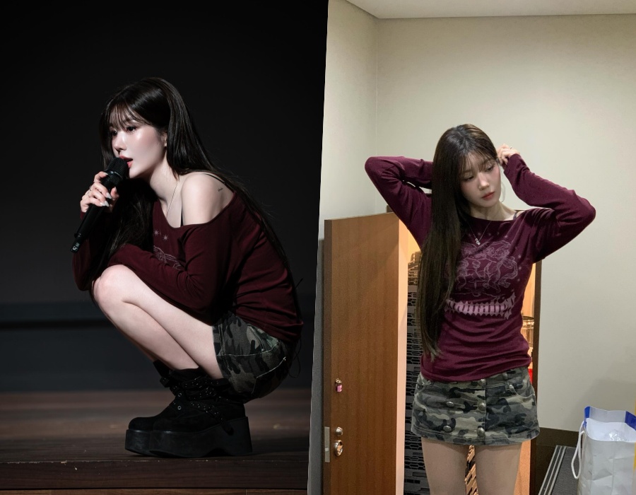 공개된 사진 속 권은비는 버건디 컬러 오프숄더 톱에 카모플라주 미니스커트를 매치해 힙한 무드를 완성했다. 한쪽 어깨를 드러낸 슬림핏 실루엣이 여성스러우면서도 강렬한 분위기를 자아낸다. 또렷한 이목구비와 긴 생머리가 더해지며 도회적인 매력이 배가된다.