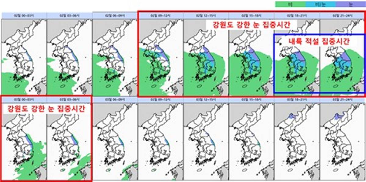 강수는 2일 강원동해안·강원산지·경북북동산지·경북북부동해안·제주에서 먼저 이어지다가, 새벽에는 호남으로, 오전에는 나머지 전국으로 확대되겠다. 이후 전북동부는 3일 새벽까지, 제주는 같은 날 오전까지, 강원과 영남은 오후까지 비나 눈이 계속될 것으로 보인다.