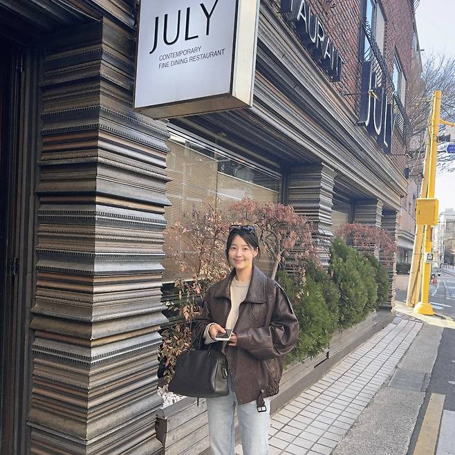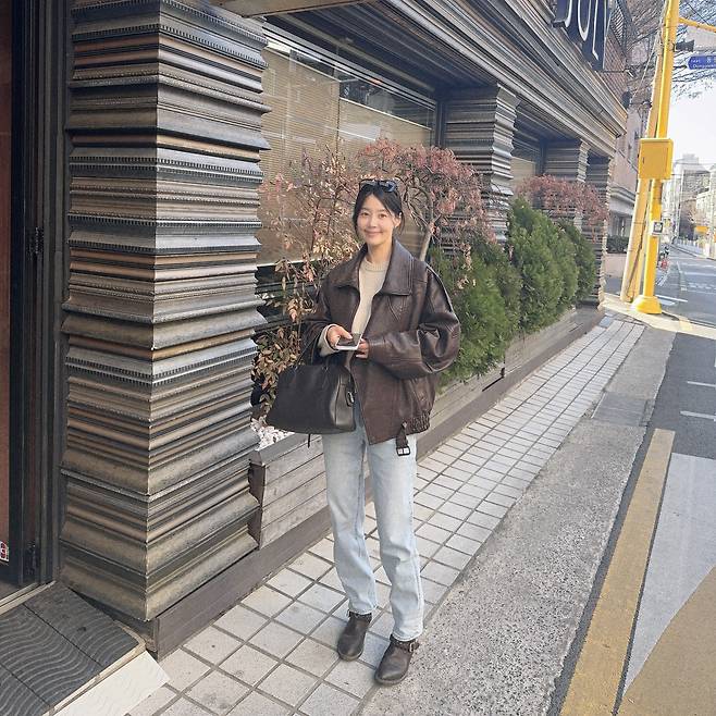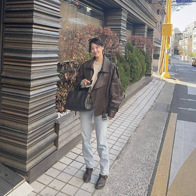"브라운 레더 자켓으로 완성한 시크한 도심 산책" 한지혜가 보여준 감각적인 일상룩